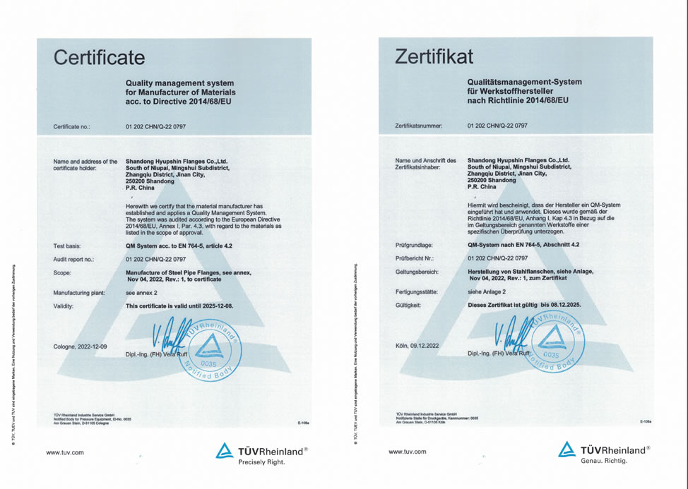 Shandong Hyupshin Flanges Co., Ltd, ISO 9001:2015 Certified Company, Korean Standards Assoction certified Company, obtain KS Certificate, KS Mark Flanges, ISO 9001: 2015 Certificate, PED Certificate, AD2000 W0 Certificate, EN 10204 3.1b Certificate, UKCA 2016 PER SAFETY Certificate